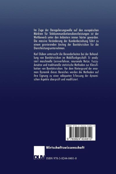 Im Zuge der Deregulierungswelle auf den europäischen Märkten für Telekommunikationsdienstleistungen ist der Wettbewerb unter den Anbietern immer härter geworden. Die massive Veränderung der Kundenbeziehung führt zu einem gravierenden Anstieg der Bonitätsrisiken für die Dienstleistungsunternehmen. Karl Dübon untersucht die Besonderheiten bei der Behandlung von Bonitätsrisiken im Mobilfunkgeschäft. Er analysiert maschinelle Lernverfahren, neuronale Netze, Fuzzy-Ansätze und traditionelle statistische Methoden zur Klassifikation von Bonitätsrisiken. Vor dem Hintergrund der enormen Dynamik dieses Bereiches werden die Methoden auf ihre Eignung zu einer adäquaten Erfassung der dynamischen Aspekte überprüft und modifiziert.