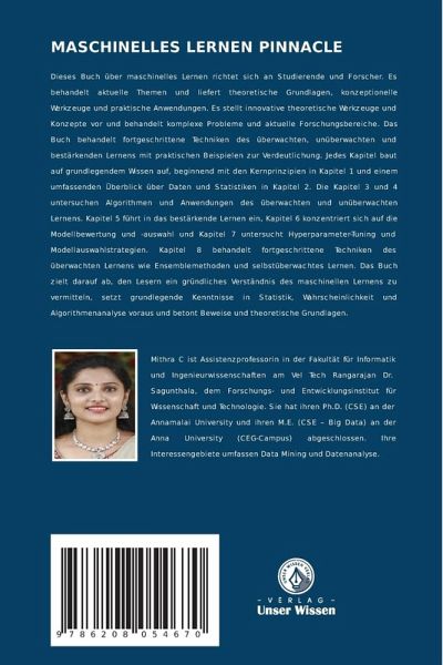 Dieses Buch über maschinelles Lernen richtet sich an Studierende und Forscher. Es behandelt aktuelle Themen und liefert theoretische Grundlagen, konzeptionelle Werkzeuge und praktische Anwendungen. Es stellt innovative theoretische Werkzeuge und Konzepte vor und behandelt komplexe Probleme und aktuelle Forschungsbereiche. Das Buch behandelt fortgeschrittene Techniken des überwachten, unüberwachten und bestärkenden Lernens mit praktischen Beispielen zur Verdeutlichung. Jedes Kapitel baut auf grundlegendem Wissen auf, beginnend mit den Kernprinzipien in Kapitel 1 und einem umfassenden Überblick über Daten und Statistiken in Kapitel 2. Die Kapitel 3 und 4 untersuchen Algorithmen und Anwendungen des überwachten und unüberwachten Lernens. Kapitel 5 führt in das bestärkende Lernen ein, Kapitel 6 konzentriert sich auf die Modellbewertung und -auswahl und Kapitel 7 untersucht Hyperparameter-Tuning und Modellauswahlstrategien. Kapitel 8 behandelt fortgeschrittene Techniken des überwachtenLernens wie Ensemblemethoden und selbstüberwachtes Lernen. Das Buch zielt darauf ab, den Lesern ein gründliches Verständnis des maschinellen Lernens zu vermitteln, setzt grundlegende Kenntnisse in Statistik, Wahrscheinlichkeit und Algorithmenanalyse voraus und betont Beweise und theoretische Grundlagen.