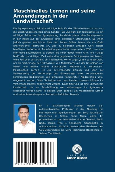 Die Agrarplanung spielt eine wichtige Rolle für das Wirtschaftswachstum und die Ernährungssicherheit eines Landes. Die Auswahl der Feldfrüchte ist ein wichtiger Faktor bei der Agrarplanung. Landwirte planen den Anbauprozess in der Regel auf der Grundlage ihrer bisherigen Erfahrungen. Da ihnen jedoch genaue Kenntnisse über den Anbau fehlen, bauen sie am Ende unerwünschte Feldfrüchte an, was zu niedrigen Erträgen führt. Daher benötigen Landwirte ein Entscheidungsunterstützungssystem (DSS), um eine informelle Entscheidung zu treffen, die ihnen dabei helfen kann, die richtige Feldfrucht zur richtigen Zeit unter den gegebenen Bedingungen anzubauen. Viele Forscher versuchen, ein intelligentes Vorhersagesystem zu entwickeln, um die Vorhersage der Ertragsrate von Nutzpflanzen auf der Grundlage von Wetter und Boden mithilfe statistischer Methoden zu verbessern. Maschinelles Lernen ist ein aufstrebender Bereich und kann zur Verbesserung der Vorhersage des Ernteertrags unter verschiedenen klimatischen Bedingungen wie Jahreszeit, Temperatur, Niederschlag usw. eingesetzt werden. Viele Techniken des maschinellen Lernens können im Vorhersageprozess angewendet werden. Klassifizierung ist eine überwachte Lerntechnik, die zur Durchführung von Vorhersagen im Agrarsektor eingesetzt werden kann. In diesem Buch geht es um maschinelles Lernen und seine Anwendungen im landwirtschaftlichen Bereich.
