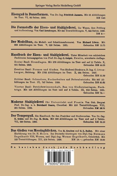Einleitung: Gründe und Voraussetzungen für die Einführung der Maschinenformerei.- I. Baugrundlagen der Formmaschinen.- A. Trennen von Form und Modell.- B. Verdichten des Sandes.- C. Gesamtaufbau und Betrieb von Formmaschinen.- II Maschinen zum Herstellen der Außenform.- A. Maschinen mit Handstampfung.- B. Maschinen mit Handpressung.- C. Maschinen mit Druckluftpressung.- D. Rüttelformmaschinen.- E. Preßrüttelformmaschinen.- F. Schleuderformmaschinen.- G. Besondere Formverfahren.- III. Maschinen zum Herstellen der Kerne.- A. Maschinen mit mechanischer Kernsandverdichtung.- B. Kernblasmaschinen.- IV. Ergänzungen und Ausblick.- 66. Sondergebiete der Maschinenformerei.- 67. Wahl der Formmasch.- 68. Vollselbsttätige Formmasch..- 69. Wissenschaftliche Weiterentwicklung.- Anmerkung: Bei den Abbildungen sind der Kürze wegen die vollständigen Namen der ausführenden Firmen nur einmal angegeben. Bei den Wiederholungen sind Abkürzungen gewählt, wie z. B. Badische Maschinenfabrik Durlach = BMD. usw..