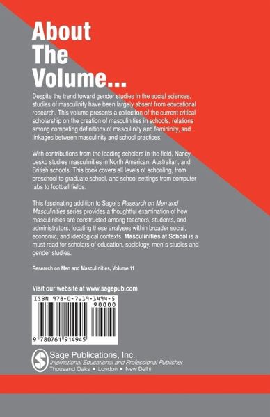 Series Editor s Foreword - Michael S. Kimmel Introduction - Nancy Lesko PART ONE: ELEMENTARY SCHOOLS The Problem(s)of Men in Early Education - James King Topologies of Masculinity - Jan Nespor Gendered Spatialities of Pre-Adolescent Boys Theorizing Urban Black Masculinity Construction in an African-Centred School - Khaula Murtadha-Watts PART TWO: SECONDARY SCHOOLS Heterosexism in Middle Schools - Laurie Mandel and Charol Shakeshaft Textbooks, Knowledge and Masculinity - Jeff Kuzmic Examining Patriarchy from Within Peer (Dis)Connections, School, and African American Masculinities - Jeremy N Price PART THREE: POST-SECONDARY SCHOOLS New Times in an Old Country - Martin Mac an Ghaill Emerging Black Gay Identities and (Hetero) Sexual Discontents Preparing to Coach - Nancy Lesko Tracking the Gendered Relations of Dominance On and Off the Football Field Striving for Educational Rigor - Melody Shank Acceptance of Masculine Privilege PART FOUR: PEDAGOGIES, POLICIES, AND LEADERSHIP Tempering the Masculinities of Technology - John Willinsky The Sounds of Silence - Jackson Katz Notes on the Personal Politics of Men s Leadership in Gender-Based Violence Prevention Education The Facts of the Case - Lyn Yates Gender Equity for Boys as a Public Policy Issue Same as it Never Was - Brian Carr Masculinity and Identification in Feminism