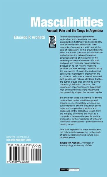 The complex relationship between nationalism and masculinity has been explored both historically and sociologically with one consistent conclusion: male concepts of courage and virility are at the core of nationalism. In this ground-breaking book, the author questions this assumption and advances the debate through an empirical analysis of masculinity in the revealing contexts of same-sex (football and polo) and cross-sex (tango) relations. Because of its rich history, Argentina provides the ideal setting in which to study the intersection of masculine and national constructs: hybridization, creolization and a culture of performance have all informed both gender and national identities. Further, the author argues that, counter to claims made by globalization theorists, the importance of performance to Argentinian men and women has a long history and has powerfully shaped the national psyche. But this book takes the analysis far beyond national boundaries to address general arguments in anthropology which are not culture-specific, and the discussion poses important comparative questions and addresses central theoretical issues, from the interplay of morality and ritual, to a comparison between the popular and the aristocratic, to the importance of 'othering' in national constructions - particularly those relating to sport. This book represents a major contribution, not only to anthropology, but to the study of gender, nationalism and culture in its broadest sense.