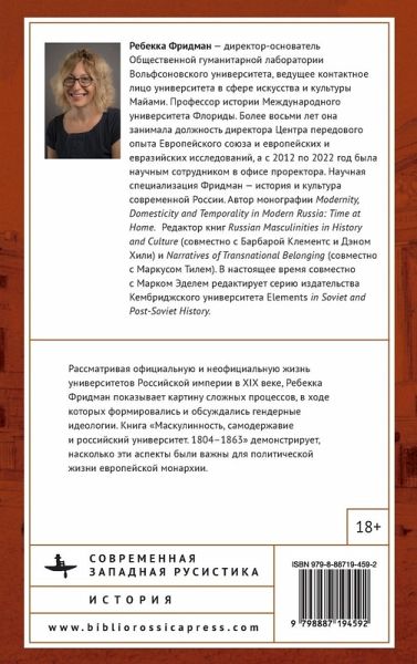 ENG This is the first book-length study of masculinity in Imperial Russia. By looking at official and unofficial life at universities across the Russian empire, this project offers a picture of the complex processes through which gender ideologies were forged and negotiated in the Nineteenth Century. Masculinity, Autocracy and the Russian University, 1804-1863 demonstrates how gender was critical to political life in a European monarchy. RUS Рассматривая официальную и неофициальную жизнь университетов Российской империи, Ребекка Фридман показывает картину сложных процессов, в ходе которых формировались и обсуждались гендерные идеологии в XIX веке. Книга 'Маскулинность, самодержавие и российский университет. 1804-1863' демонстрирует, насколько эти аспекты были важны для политической жизни европейской монархии.