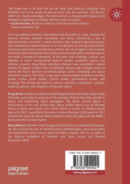 Chapter 1. Introduction.- Chapter 2. Understanding the Community College Male Dance Experience.- Chapter 3. Generalist Elementary Male Teachers Advocating for Dance and Male Dancers.- Chapter 4. Listening to Why Boys (Don't) Dance: Creating Inclusive Dance Experiences for Boys.- Chapter 5. Dancing Boys and Men: Negotiating Masculinity and Sexuality.- Chapter 6. Parental Perspectives on Their Sons' Motivations to Dance.- Chapter 7. Masculinities and Performativities in Native American Dance.- Chapter 8. Dancing Between Queer Failure and Participatory Pedagogy.- Chapter 9. Marketing Dance to Boys and Men: New, Complex and Dynamic Practices of Masculinities.- Chapter 10. Fear, Coping, and Peer Support in Male Dance Students' Reflections.- Chapter 11. A Course on Movement Enhancement Skills for Men.- Chapter 12. Black Bodies Dancing Defiance: Deez Nuts!. Chapter 13. Pink Feathers in the Ballet Closet: Three Gay Remakes of Swan Lake. Chapter 14. Hypermasculinity Makes the Queer Boy Faint.- Chapter 15. Dancing a Love/Hate Relationship: A Case Study on Lingering Aspirations. Chapter 16. Afterword(s).