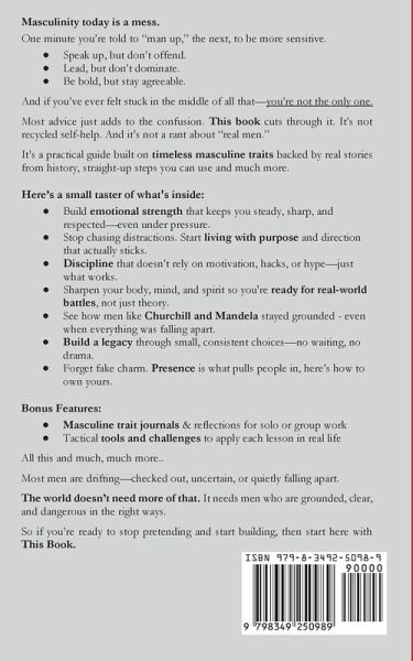 Masculinity today is a mess. Most advice just adds to the confusion. This book cuts through it. It's not recycled self-help. And it's not a rant about "real men." It's a practical guide built on timeless masculine traits backed by real stories from history, straight-up steps you can use and much more. Here's a small taster of what's inside:Build emotional strength that keeps you steady, sharp, and respected-even under pressure. Stop chasing distractions. Start living with purpose and direction that actually sticks. Discipline that doesn't rely on motivation, hacks, or hype-just what works. Sharpen your body, mind, and spirit so you're ready for real-world battles, not just theory. See how men like Churchill and Mandela stayed grounded - even when everything was falling apart. Build a legacy through small, consistent choices-no waiting, no drama. Forget fake charm. Presence is what pulls people in, here's how to own yours. All this and much, much more.. Most men are drifting-checked out, uncertain, or quietly falling apart. The world doesn't need more of that. It needs men who are grounded, clear, and dangerous in the right ways. So if you're ready to stop pretending and start building, then start here with This Book.