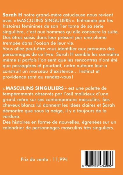 Entraînée par les histoires féminines de son premier tome de sa série singulière, c'est aux hommes que Sarah H consacre la suite. Des êtres saisis dans leur présent par une plume trempée dans l'océan de leur vie.Vous vous identifierez peut-être aux prénoms des personnages de ce livre. Sarah H semble les connaître même si parfois l'on sent que les rencontres n'ont été que passagères et pourtant, notre auteure leur a construit un morceau d'existence. Instinct et providence sont au rendez-vous !Masculins Singuliers est une palette de tempéraments observés par l'oeil malicieux d'une grand-mère sur ses contemporains masculins. Ses cheveux blancs lui donnent les idées claires et Sarah démontre que sous la neige, il y a toujours de la verdure. Des histoires en forme de nouvelles, égrenées sur un calendrier de personnages masculins très singuliers.