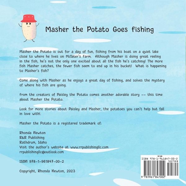 Masher the Potato is out for a day of fun, floating in his boat on a quiet lake close to where he lives on McTater's Farm. Although Masher is doing great reeling in the fish, he's not the only one excited about all the fish he's catching. The more fish Masher catches, the fewer fish seem to end up in his bucket. Where are all of Masher's fish going? Come along with Masher as he enjoys a great day of fishing and solves the mystery of his disappearing fish.