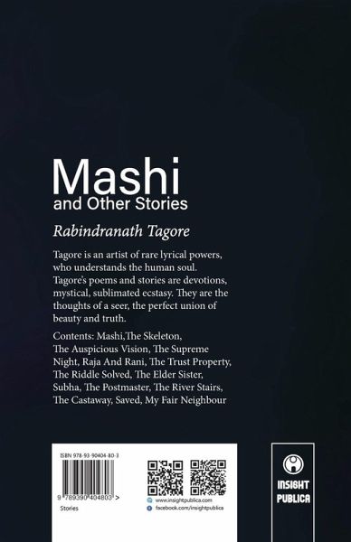 Tagore is an artist of rare lyrical powers, who understands the human soul. Tagore's poems and stories are devotions, mystical, sublimated ecstasy. They are the thoughts of a seer, the perfect union of beauty and truth. Contents: Mashi,The Skeleton, The Auspicious Vision, The Supreme Night, Raja And Rani, The Trust Property, The Riddle Solved, The Elder Sister, Subha, The Postmaster, The River Stairs, The Castaway, Saved, My Fair Neighbour