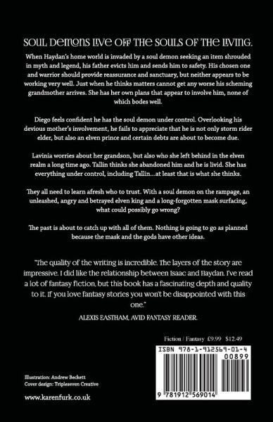 Soul Demons live off the souls of the living. When Haydan’s home world is invaded by a soul demon seeking an item shrouded in myth and legend, his father evicts him and sends him to safety. His chosen one and warrior should provide reassurance and sanctuary, but neither appears to be working very well. Just when he thinks matters cannot get any worse his scheming grandmother arrives. She has her own plans that appear to involve him, none of which bodes well. Diego feels confident he has the soul demon under control. Overlooking his devious mother’s involvement, he fails to appreciate that he is not only storm rider elder, but also an elven prince and certain debts are about to become due. Lavinia worries about her grandson, but also who she left behind in the elven realm a long time ago. Tallin thinks she abandoned him and he is livid. She has everything under control, including Tallin…at least that is what she thinks. They all need to learn afresh who to trust. With a soul demon on the rampage, an unleashed, angry and betrayed elven king and a long-forgotten mask surfacing, what could possibly go wrong? The past is about to catch up with all of them. Nothing is going to go as planned because the mask and the gods have other ideas. Mask of the Gods is the first book in the Mask Chronicles from debut author Karen Furk. Enter a world of fantasy fiction that’s richly layered and full of intrigue. If you enjoy reading stories full of creative world building, magical creatures, portals, ancient artifacts and fantasy races, combined with plenty of excitement and adventure then you will love the start of this series of books.