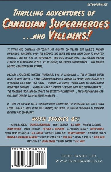 Thrilling Tales of Canadian superheroes... and villains! 75 years ago Canadian cartoonist Joe Shuster co-created the world's premier superhero: Superman. Over the decades the genre has gone from camp to counter-culture, from pop art to postmodern, from noir to new wave. Today's superheroes feature in bestselling novels, hit TV shows, Hollywood blockbusters ... and Masked Mosaic: Canadian Super Stories. Mexican luchadores wrestle primordial evil in Vancouver ... The Intrepids battle Nazis in Nova Scotia ... A mysterious masked man rescues an adventuring heiress in a steampunk Gold Rush-era Yukon ... Zombies and ancient Viking magic are unleashed in downtown Toronto ... A godlike oracle wanders Calgary with her cyborg handler ... The fearsome Iron Shadow stalks the streets of Kingstonia ... The Coachwhip and Cat-Girl fight crime in lurid wartime Montreal ... In these 24 tales Canada's most daring writers reimagine the super genre from its outer limits to its pulp origins, exploring the diverse landscape of Canadian identity and geography. With stories by: Marie Bilodeau ~ Chantal Boudreau ~ Kristi Charish ~ E.L. Chen ~ Michael S. Chong ~ Kevin Cockle ~ Emma Faraday ~ Patrick T. Goddard ~ Alyxandra Harvey ~ David Nickle ~ Silvia Moreno-Garcia ~ D.K. Latta ~ Michael Matheson ~ Derryl Murphy ~ Jonathan Olfert ~ Rhonda & Jonathan Parrish ~ David Perlmutter ~ Lisa Poh ~ Jason S. Ridler ~ Rhea Rose ~ Mike Rimar ~ Jason Sharp ~ Emma Vossen ~ A.C. Wise Featuring an Introduction by Mark Shainblum, creator of Northguard. Editors: Claude Lalumière & Camille Alexa