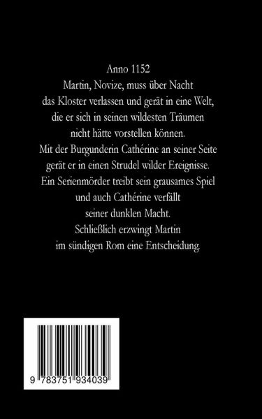 Anno 1152Martin, Novize, muss über Nacht die Geborgenheit seines Klosters verlassen. Er kommt an den herzoglichen Hof und gerät in eine Welt, die er sich in seinen wildesten Träumen nicht hätte vorstellen können. Auf Reisen und Feldzügen begleitet er den Herzog von Rochefort, lernt die Grausamkeiten des Krieges, die Feinheiten der Politik sowie die Reize der Frauen kennen. Als er glaubt, mit der vom Schicksal gezeichneten Cathérine das Glück seines Lebens gefunden zu haben, fallen dunkle Schatten über sie. Im Umfeld des Hofes treibt ein Serienmörder sein grausames Spiel und auch Cathérine sieht sich von ihm verfolgt. Verzweifelt versucht sie ihm zu entkommen und treibt immer tiefer in einen Strudel dunkler Macht. Bei dem Versuch, sie zu beschützen, gerät Martin ins Visier des Mörders. Im sündigen Rom erzwingt er schließlich eine Entscheidung.