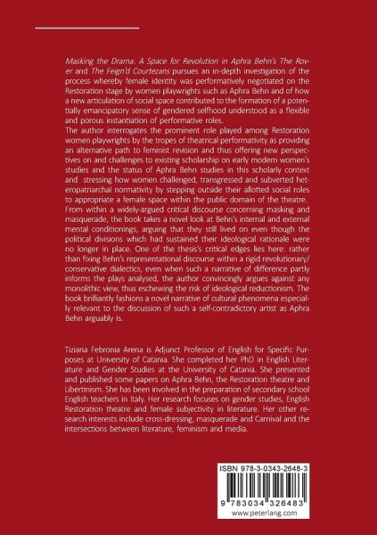 From within a widely-argued critical discourse concerning masking and masquerade, the book takes a novel look at Behn's internal and external mental conditionings, arguing that they still lived on even though the political divisions which had sustained their ideological rationale were no longer in place. One of the thesis's critical edges lies here: rather than fixing Behn's representational discourse within a rigid revolutionary/conservative dialectics, even when such a narrative of difference partly informs the plays analysed, the author convincingly argues against any monolithic view, thus eschewing the risk of ideological reductionism. The book brilliantly fashions a novel narrative of cultural phenomena especially relevant to the discussion of such a self-contradictory artist as Aphra Behn arguably is.