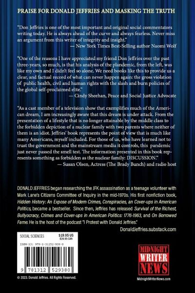In Masking the Truth: How COVID-19 Destroyed Civil Liberties and Shut Down the World, best-selling author Donald Jeffries thoroughly documents what he calls "The Greatest Psyop in the History of the World." From padding the stats for "COVID" deaths that were from other causes, to admitting the COVID-19 strain has never been isolated, to covering up the massive numbers of deaths and injuries from the "Warp Speed" vaccine, Jeffries shows how we have been lied to repeatedly about every aspect of the COVID narrative, from the very beginning. "Don Jeffries is one of the most important and original social commentators writing today. He is always ahead of the curve and always fearless. Never miss an argument from this writer of integrity and insight." - New York Times Best-Selling author Naomi Wolf "One of the reasons I have appreciated my friend Don Jeffries over the past three-years, so much, is that his analysis of the plandemic, from the left, was like my own and I didn't feel so alone. We need books like this to provide us a clear, and factual record of what can never happen again: the gross violation of public health, civil and human rights with the slash and burn policies of the global self-proclaimed elite." - Cindy Sheehan, Peace and Social Justice Advocate "As a cast member of a television show that exemplifies much of the American dream, I am increasingly aware that this dream is under attack. From the presentation of a lifestyle that is no longer attainable by the middle class to the forbidden depiction of a nuclear family with two parents where neither of them is an idiot. Jeffries' book represents the point of view that is much like many Americans, myself included. For those of us, who have learned not to trust the government and the mainstream media it controls, this pandemic just never passed the smell test. The information presented in this book represents something as forbidden as the nuclear family: DISCUSSION." - Susan Olsen, Actress (The Brady Bunch) and radio host