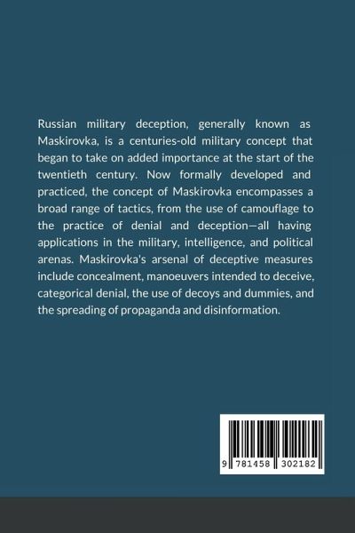Russian military deception, generally known as Maskirovka, is a centuries-old military concept that began to take on added importance at the start of the twentieth century. Now formally developed and practiced, the concept of Maskirovka encompasses a broad range of tactics, from the use of camouflage to the practice of denial and deception-all having applications in the military, intelligence, and political arenas. Maskirovka's arsenal of deceptive measures include concealment, manoeuvers intended to deceive, categorical denial, the use of decoys and dummies, and the spreading of propaganda and disinformation.
