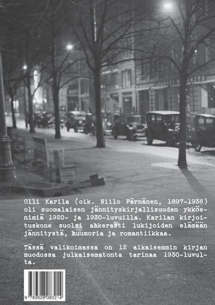 Leppoisia rikostarinoita 1930-luvulta 1920- ja 1930-lukujen suosituimpiin rikoskirjailijoihin kuulunut Olli Karila kirjoitti romaaniensa lisäksi kymmeniä jännitysnovelleja. Tässä uudessa valikoimassa on 12 vanhanaikaisen viehättävää rikostarinaa, joita ei ole aiemmin julkaistu kirjan muodossa. Karilan tarinoissa sukelletaan 1930-luvun Suomeen, jossa pirtun salakuljettajat ottavat yhteen tullimiesten kanssa, neuvostovakoojat urkkivat suomalaisia sotasalaisuuksia ja ovelat murtovarkaat pyrkivät tyhjentämään maalaiskartanoita arvoesineistä. Tapahtumapaikkoina ovat niin kaupungit kuin maaseutu, puhumattakaan Monte Carlosta, jossa suomalainen sankari saa selviytyä kansainvälisten rikollisten kynsissä. Kirjan on toimittanut aikakauden kirjalliseen elämään erikoistunut historiantutkija, FT Juha Järvelä.