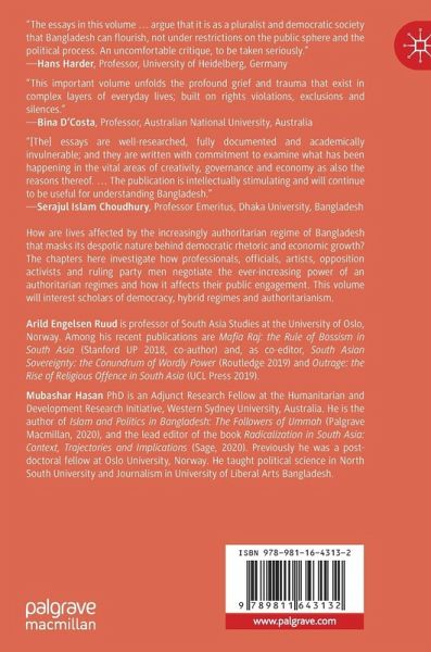 Chapter 1. Introduction.- Part I. The media.- Chapter 2. The everyday politics of rumours and information: local journalism and social media in an authoritarian party-state regime in Bangladesh.- Chapter 3. Working Under the 'Sword of Damocles': Experiences of Journalists in a Hybrid Regime.- Part II. Alternative voices - three snapshots.- Chapter 4. The Rebels and the Conformers: Competing Patterns in Bangladeshi Rap Music.- Chapter 5. Life in a Hybrid Regime: Everyday struggles of gay men in Bangladesh.- Chapter 6. Targeted by Militants and Abandoned by the State: The Case of Shuddhashar Publication House.- Part III. The intellectuals.- Chapter 7. Manufacturing Consent, Silencing Dissent: The Case of Academic Freedom in Bangladesh.- Chapter 8. Making Cinema within Authoritarian Codes: The Case of Bangladesh.- Part IV. The unengaged - three snapshots.- Chapter 9. Are mega 'development' projects inherently undemocratic?: Field narratives from the projects sites.- Chapter 10. Everyday life in a hybrid regime: The case of health sector in Bangladesh.- Chapter 11. In the borderland: Everyday coping among Rohingya refugees.- Part V. The Political Stratum.- Chapter 12. The win-win game in politics: A study of the student wing of the ruling party in Bangladesh.- Chapter 13. Life of Jamaat e Islami and Its Political Allies in a Hybrid Regime.- Chapter 14. 'If I am arrested, who will I do politics for?' Repression and resistance at the base of the Bangladesh Nationalist Party.- Chapter 15. Afterword.