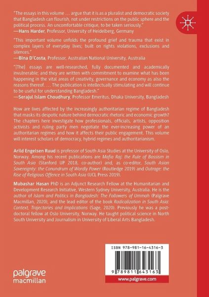Chapter 1. Introduction.- Part I. The media.- Chapter 2. The everyday politics of rumours and information: local journalism and social media in an authoritarian party-state regime in Bangladesh.- Chapter 3. Working Under the 'Sword of Damocles': Experiences of Journalists in a Hybrid Regime.- Part II. Alternative voices - three snapshots.- Chapter 4. The Rebels and the Conformers: Competing Patterns in Bangladeshi Rap Music.- Chapter 5. Life in a Hybrid Regime: Everyday struggles of gay men in Bangladesh.- Chapter 6. Targeted by Militants and Abandoned by the State: The Case of Shuddhashar Publication House.- Part III. The intellectuals.- Chapter 7. Manufacturing Consent, Silencing Dissent: The Case of Academic Freedom in Bangladesh.- Chapter 8. Making Cinema within Authoritarian Codes: The Case of Bangladesh.- Part IV. The unengaged - three snapshots.- Chapter 9. Are mega 'development' projects inherently undemocratic?: Field narratives from the projects sites.- Chapter 10. Everyday life in a hybrid regime: The case of health sector in Bangladesh.- Chapter 11. In the borderland: Everyday coping among Rohingya refugees.- Part V. The Political Stratum.- Chapter 12. The win-win game in politics: A study of the student wing of the ruling party in Bangladesh.- Chapter 13. Life of Jamaat e Islami and Its Political Allies in a Hybrid Regime.- Chapter 14. 'If I am arrested, who will I do politics for?' Repression and resistance at the base of the Bangladesh Nationalist Party.- Chapter 15. Afterword.