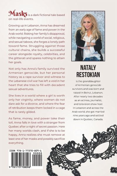 Masks is a dark fictional tale, based on true-life events. It narrates the adventures of a young Armenian girl born in Lebanon in the seventies. She dreams of fame and power in Lebanon and the Arab world and shows resilience and motivation beyond her years. The novel delves into the world of the protagonist, Anna, who is surrounded by social, religious, and sexual taboos. She fiercely breaks the chains to enter the world she has strived to reach, in a seemingly conservative society barely emerging from a civil war. She builds her success on her remaining values, challenging her fate and sparing no way means to attain her goals. As a disappointment to her parents, she walks the challenging paths alone, making her way toward fame and fortune despite lacking the support system to do so. Doors begin to open for her, and she enters the world of Arab celebrities. She is now a public figure in the Middle East, living an immoral married life in a materialistic world surrounded by influential business people and royal family members. She tries, in vain, to fill the void in her soul with sexual adventures and controversy by taking a wide variety of lovers. Her adventures invariably end in misery, doing nothing to awaken her from her numbness. Still, her vivid, out-of-control personality helps her move forward while simultaneously getting her in trouble. In the early stages of her life, she has suffered the unthinkable, being bullied and raped, with the civil war a constant backdrop throughout most of her childhood. The novel delves deep into Anna's mind as she has flashbacks of the trauma she has suffered, offering the reader a hint of an explanation for her behavior. In a society in which men dominate women, she is one of the few who realize that fashion, social status, plastic surgeries, and bright smiles are not the answer to happiness. She lives in a world where a girl is only worth as much as her virginity, where women do not dare to ask for a divorce, where the fear of retribution keeps them locked in a cage that is very rarely gilded. As fame, money, and power slowly eat at her soul, the arrogant Anna falls in love with a total stranger—a young, single bachelor from Canada—after a night of secret passion. That is where the story begins to unravel as she returns home with a scandal in her back pocket, her eyes and ears and heart tuned to this man instead of her husband. Anna realizes that neither her marriage nor her achievements have ever made her happy, so she decides to throw it all away. The lies and deceit that fill the so-called glamorous life she has been leading are floating up to the surface, including her husband's infidelity and the critical steps she has taken to reach the top. Marriage, family, career—all destroyed to be united with the stranger. She starts a new battle, this time struggling to change her destiny for someone she barely knows, who lives oceans apart and offers her nothing except his heart. She risks everything, turning her whole life upside down. Anna realizes that her happiness, inner peace, and love are found worlds away from her own, with someone she would never have expected to be her soul mate. Still, Anna's sacrifices are not behind her, and the struggle has not yet ended, although she has found what she has needed all her life: redemption and unconditional love. The stranger enigmatically hints at emotions in Anna that have been hidden for a long time behind the masks of her dark and shallow lifestyle. The characters in the story are the voices of so many who do not dare to speak up in a world where social and religious standards openly chastise the very actions that behind closed doors have become the ultimate paradigmatic way of life.