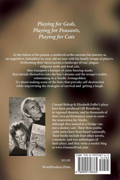 At the behest of his patron, a medieval scribe narrates his ordeal as an inquisitive, befuddled six-year-old on tour with his family troupe of players. Performing their farces across a landscape of war, plague, religious strife and feral cats, they travel from sunny Greece into the uncharted north, playing market fairs and noblemen's banquets, while transporting a hamper of curse-bearing masks that intrude themselves into the boy's dreams and the troupe's reality, culminating in a Nordic Armageddon. Though set in Late Antiquity, it's based on the authors' own experience as a family of traveling players with an offbeat mix of farce and tragedy: playing for gods, playing for peasants, playing for cats. It's about carrying the curses bequeathed by previous generations, dealing with catcalls and calamities, improvising making sense of the fears that provoke self-destruction and improvising the strategies of daily survival.
