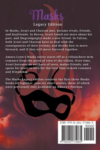 In Masks, Avari and Chayton met, became rivals, friends, and boyfriends. In Raven, Avari found out more about his past, and (begrudgingly) made a new friend. In Falcon, both Avari and Chayton have to deal with the consequences of their actions, and decide how to move forward, and if they will move forward together. Amara Lynn's Masks series starts off as a villain/hero m/m romance from the point of view of the villain. Over time, Avari becomes an antihero of sorts, makes friends, and opens his heart to love for the first time in both romance and friendship. The Masks Legacy edition contains the first three Masks books all together, plus six short stories, three of which were previously only available on Amara's Patreon.