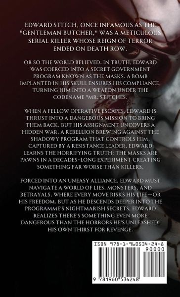 Edward Stitch, once infamous as the "Gentleman Butcher," was a meticulous serial killer whose reign of terror ended on death row. Or so the world believed. In truth, Edward was coerced into a secret government program known as the Mask Programme. A bomb implanted in his skull ensures his compliance, turning him into a weapon under the codename "Mr. Stitches. When a fellow operative escapes, Edward is thrust into a dangerous mission to bring them back. But his assignment uncovers a hidden war, a rebellion brewing against the shadowy program that controls him. Captured by a resistance leader, Edward learns the horrifying truth: the Masks are pawns in a decades-long experiment creating something far worse than killers. Forced into an uneasy alliance, Edward must navigate a world of lies, monsters, and betrayals, where every move risks his life-or his freedom. But as he descends deeper into the Programme's nightmarish secrets, Edward realizes there's something even more dangerous than the horrors he's unleashed: his own thirst for revenge. Twisting, relentless, and brimming with darkness, Masks is a high-octane thriller where the lines between predator and prey blur-and no one escapes unscathed.