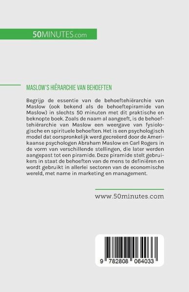 Begrijp de essentie van de behoeftehiërarchie van Maslow (ook bekend als de behoeftepiramide van Maslow) in slechts 50 minuten met dit praktische en beknopte boek. Zoals de naam al aangeeft, is de behoeftehiërarchie van Maslow een weergave van fysiologische en spirituele behoeften. Het is een psychologisch model dat oorspronkelijk werd gecreëerd door de Amerikaanse psychologen Abraham Maslow en Carl Rogers in de vorm van verschillende stellingen, die later werden aangepast tot een piramide. Deze piramide stelt gebruikers in staat de behoeften van de mens te definiëren en wordt gebruikt in allerlei sectoren van de economische wereld, met name in marketing en management. Dit boek biedt u een handige inleiding tot de behoeften van de mens, gaande van de meest elementaire en essentiële tot de minder tastbare, zoals zelfverbetering. U leert niet alleen hoe u de vijf niveaus van behoeften kunt identificeren, maar u zult ook casestudy's uit de praktijk bekijken, de tekortkomingen van het model ontdekken, waaronder het etnocentrisme, en kennismaken met verwante modellen, zoals de ERG-theorie. Over de behoeftehiërarchie van Maslow : De behoeftehiërarchie van Maslow ontstond in de jaren 1940 en had tot doel een nieuwe benadering van de humanistische psychologie te introduceren. Maslow onderscheidt vijf verschillende niveaus van behoeften: behoeften aan veiligheid, erkenning, waardering, zelfrealisatie en fysiologische behoeften. Het model maakt de eenvoudige en effectieve identificatie van behoeften mogelijk, zolang ze niet worden beschouwd als verschillende stadia, maar als een geheel. In dit boek ontdekt u hoe de behoeftehiërarchie van Maslow u kan helpen, leert u hoe u deze kunt gebruiken om behoeften te definiëren, en gebruikt u de resultaten om uw marketingstrategieën aan te passen. Een duidelijke uitleg van de voordelen en mogelijke nadelen van de methode, een bespreking van een praktische casus en een inleiding tot verwante modellen geven u de instrumenten die u nodig hebt om uw aanpak op uw situatie af te stemmen.