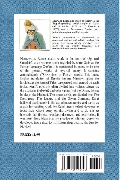Masnawi: is Rumi's major work in the form of (Spiritual Couplets), a six-volume poem regarded by some Sufis as the Persian-language Qur'an. It is considered by many to be one of the greatest works of mystical poetry. It contains approximately 27,000 lines of Persian poetry. This book, English translation of Rumi's famous Masnavi, gives the booklets as the form of Tales, categorized and focused on each topics. Rumi's poetry is often divided into various categories: the quatrains (rubayat) and odes (ghazal) of the Divan, the six books of the Masnavi. The prose works are divided into The Discourses, The Letters, and the Seven Sermons. Rumi believed passionately in the use of music, poetry and dance as a path for reaching God. For Rumi, music helped devotees to focus their whole being on the divine and to do this so intensely that the soul was both destroyed and resurrected. It was from these ideas that the practice of whirling Dervishes developed into a ritual form. His teachings became the base for Mevlevi.