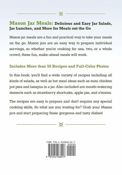 Mason Jar Meals: Delicious and Easy Jar Salads, Jar Lunches, and More for Meals on the Go Mason jar meals are a fun and practical way to take your meals on the go. Mason jars are an easy way to prepare individual servings, so whether you're cooking for one, two, or a whole crowd, these fun, make-ahead meals will work. Includes More than 50 Recipes and Full-Color Photos In this book, you'll find a wide variety of recipes including all kinds of salads, as well as hot meal ideas such as mini chicken pot pies and lasagna in a jar. Also included are mouth-watering desserts such as strawberry shortcake, apple pie, and s'mores. The recipes are easy to prepare and don't require any special cooking skills. So what are you waiting for? Grab your Mason jars and start preparing these gorgeous and tasty dishes! Sample recipes include: *Shake It Up Salad *Rainbow Fruit Salad *Spinach Blueberry Salad *Greek Chicken Salad *Tortellini Salad in a Jar *California Roll Salad *Chopped Spinach and Kale Salad with Apples *Shrimp and Mango Orzo Salad *Mini Chicken Pot Pies *No-Bake Chocolate Crusted Cheesecake And lots more...