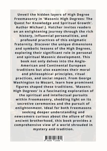 Step into the enigmatic world of High Degree Freemasonry with Michael J. Hatcher's 'Masonic High Degrees: The Quest for Knowledge and Spiritual Growth'. This book presents a captivating exploration into one of the most secretive and influential fraternities in history, revealing the deeper layers of Freemasonry that are often shrouded in mystery.Delve into the history of High Degree Freemasonry, tracing its roots from medieval stonemasons to the present day. Hatcher meticulously outlines how these degrees evolved over centuries, blending historical facts with the allure of mystery that has always surrounded this organization. The book provides a rare glimpse into the rituals, symbols, and teachings of the High Degrees, which have been closely guarded for centuries.'Masonic High Degrees' does not merely recount historical events and rituals; it also dives into the philosophical and moral underpinnings of Freemasonry. Discover the complex symbolic language of Freemasonry and its intention to impart moral and ethical lessons. Hatcher eloquently discusses the principles of brotherly love, relief, and truth, and how these form the cornerstone of Masonic teachings.The book also highlights the significant contributions of notable Freemasons throughout history. From the influence of George Washington in American Freemasonry to Mozart's Masonic-inspired compositions, Hatcher illustrates how Freemasonry has been interwoven with the fabric of history and culture.Moreover, 'Masonic High Degrees' delves into the differences and similarities between the Anglo-American and Continental European Masonic traditions. The reader is taken on a journey through various Masonic rites, each with its unique history and practices, providing a comprehensive understanding of the global impact of Freemasonry.Hatcher also addresses the misconceptions and controversies surrounding Freemasonry. By shedding light on the secretive aspects of its practices, he demystifies the organization and provides a balanced view of its role in society.This book is not just for Freemasons seeking to deepen their understanding of their fraternity. It is also perfect for historians, spiritual seekers, and anyone curious about secret societies and their impact on history and culture. 'Masonic High Degrees' offers a window into a world of tradition, ritual, and moral philosophy, inviting readers to reflect on the broader implications of these teachings in today's world.In 'Masonic High Degrees: The Quest for Knowledge and Spiritual Growth', Michael J. Hatcher has crafted a work that is both enlightening and thought-provoking, offering a rare and comprehensive view of High Degree Freemasonry. It's a journey through time, philosophy, and the hidden corridors of one of the world's oldest fraternal organizations, making it a must-read for anyone interested in the mysteries of Freemasonry and the search for spiritual and intellectual enlightenment.