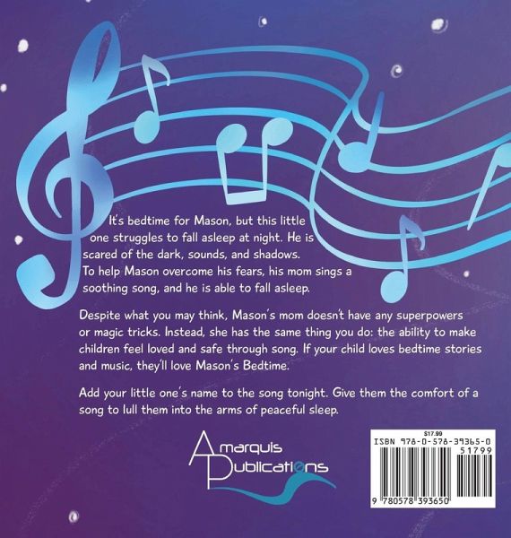 It's bedtime for Mason, but this little one struggles to fall asleep at night. He is scared of the dark, sounds, and shadows. To help Mason overcome his fears, his mom sings a soothing song, and he is able to fall asleep. Despite what you may think, Mason's mom doesn't have any superpowers or magic tricks. Instead, she has the same thing you do: the ability to make children feel loved and safe through song. If your child loves bedtime stories and music, they'll love Mason's Bedtime. Add your little one's name to the song tonight. Give them the comfort of a song to lull them into the arms of peaceful sleep.…mehr