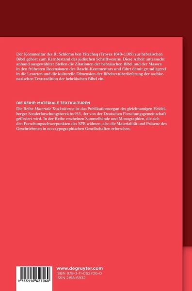 Der mittelalterliche Kommentar des Raschi (R. Schlomo ben Yitzchaq, Troyes 1040-1105) gehört zum Kernbestand des jüdischen Schriftwesens. Der Raschi-Kommentar wird bis heute in den jüdischen Druckausgaben der hebräischen Bibel an der Seite des hebräischen Obertextes abgedruckt und zur Lesung des Wochenabschnitts stets mit rezipiert. Diese Arbeit untersucht anhand ausgewählter Stellen die Zitationen der hebräischen Bibel und der Masora in den frühesten handschriftlichen Rezensionen des Raschi-Kommentars und die Eigenschaften des dem Kommentar zugrunde liegenden hebräischen Bibeltextes und der Masora. Die Arbeit führt grundlegend in die mittelalterliche jüdische Bibelauslegung ein und beobachtet die Bibeltextüberlieferung anhand von Lesarten der aschkenasischen Texttradition. Es kann gezeigt werden, dass den Autoren des Raschi-Kommentars im 12. und 13. Jh. ein hebräischer Bibeltext vorlag, der sich in der materialen Kultur der Artefakte, in den Lesarten des Obertextes und in der Art und Umfang der Masora von der heute rezipierten hebräischen Bibel (Kodex Leningradensis / BHS) unterschied, und dass die aschkenasische Texttradition sukzessive durch die nach Westeuropa eindringende Tradition orientalischer Kodizes verdrängt worden ist. Das Buch bietet eine grundlegende Einführung in die bis heute wenig beachtete Tradition der hebräischen Bibeltextüberlieferung des westeuropäischen Judentums und ist eine Fundgrube für textgeschichtlich und exegetisch interessierte Theologen, Judaisten und Mediävisten.