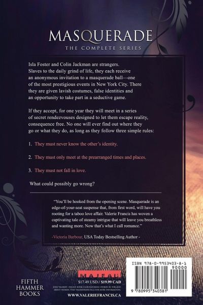 What would you do if you knew you wouldn't get caught? Isla Foster and Colin Jackman are strangers. Slaves to the daily grind of life, they each receive an anonymous invitation to a masquerade ball - one of the most prestigious events in New York City. There they are given lavish costumes, false identities and an opportunity to take part in a seductive game. If they accept, for one year they will meet in a series of secret rendezvous designed to let them escape reality, consequence free. No one will ever find out where they go or what they do, as long as they follow three simple rules: 1. they must never know the other's identity 2. they must only meet at the prearranged times and places 3. they must not fall in love What could possibly go wrong? Masquerade is a romantic suspense told in 12 parts. It's been designed for busy people who love to read but find they have little time due to work and family obligations. Each part is about the length of a glass of wine, a soak in the tub or an evening commute. Indulge in a little escape from the everyday. Read these books alone or with your partner and ask yourselves, what would you do if you knew you wouldn't get caught?