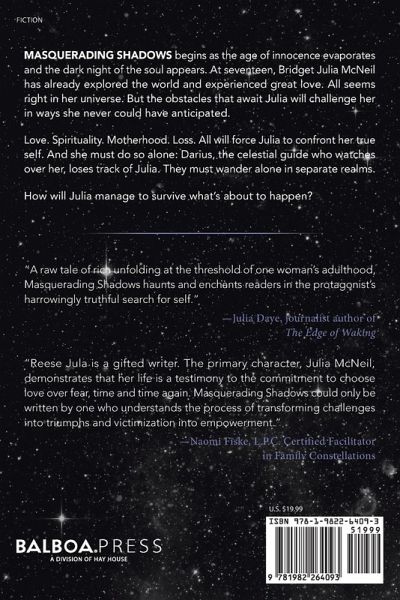 MASQUERADING SHADOWS begins as the age of innocence evaporates and the dark night of the soul appears. At seventeen, Bridget Julia McNeil has already explored the world and experienced great love. All seems right in her universe. But the obstacles that await Julia will challenge her in ways she never could have anticipated. Love. Spirituality. Motherhood. Loss. All will force Julia to confront her true self. And she must do so alone: Darius, the celestial guide who watches over her, loses track of Julia. They must wander alone in separate realms. How will Julia manage to survive what's about to happen?