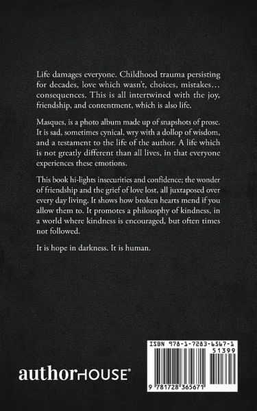 Life damages everyone. Childhood trauma persisting for decades, love which wasn't, choices, mistakes...consequences. This is all intertwined with the joy, friendship, and contentment, which is also life. Masques, is a photo album made up of snapshots of prose. It is sad, sometimes cynical, wry with a dollop of wisdom, and a testament to the life of the author. A life which is not greatly different than all lives, in that everyone experiences these emotions. This book hi-lights insecurities and confidence; the wonder of friendship and the grief of love lost, all juxtaposed over every day living. It shows how broken hearts mend if you allow them to. It promotes a philosophy of kindness, in a world where kindness is encouraged, but often times not followed. It is hope in darkness. It is human.