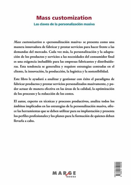 Mass customization o personalización masiva se presenta como una manera innovadora de fabricar y prestar servicios para hacer frente a las demandas del mercado. Cada vez más, la personalización y la adaptación de los productos y servicios a las necesidades del consumidor final es una exigencia ineludible para las empresas fabricantes y distribuidoras. Esta tendencia se generaliza y requiere estrategias centradas en el cliente, la innovación, la producción, la logística y la sostenibilidad. Este libro le ayudará a analizar y gestionar con éxito el paradigma de fabricar productos y prestar servicios personalizados masivamente, y poder actuar de manera efectiva en las áreas de la calidad, la optimización de los procesos y la reducción de los costes. El autor, experto en técnicas y procesos productivos, analiza todos los ámbitos implicados en las estrategias de la personalización masiva, ofrece las herramientas que se deben utilizar para su implantación y presenta los perfiles profesionales y los planes para la formación de quienes deban llevarla a cabo.