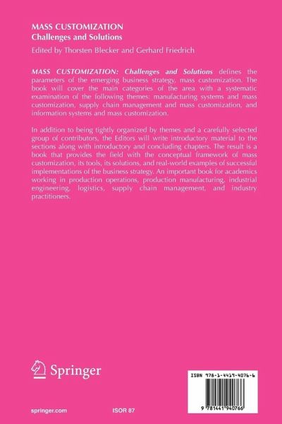 Mass Customization: Challenges and Solutions defines the parameters of the emerging business strategy, mass customization. The book will cover the main categories of the area with a systematic examination of the following themes: manufacturing systems and mass customization, supply chain management and mass customization, and information systems and mass customization.