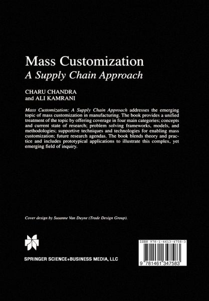 Mass Customization: A Supply Chain Approach is a text on the emerging topic of mass customization in manufacturing. The contributed chapters in this book provide a unified treatment to the topic by offering coverage in four main categories - concepts and current state of research; problem solving frameworks, models, and methodologies; supportive techniques and technologies for enabling mass customization; and future research agenda. The book blends theory and practice and includes prototypical applications to illustrate this complex, yet emerging field of inquiry.
