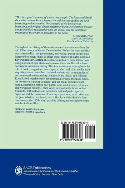 This is a good treatment of a very timely topic. The historical detail the authors amass here is impressive and the case studies are both interesting and instructive. The strengths of the book are its interesting and original documentation of the role of different interest groups and their relationship with the media, and the contextual treatment of the evidence presented in the book. K. Viswanath, School of Journalism, The Ohio State University Throughout the history of the environmental movement--from the mid-19th century to Rachel Carson in the 1960s--the mass media, the environmentalists, the government, and various power groups have interacted on many levels to effect social change. In Mass Media and Environmental Conflict, the authors emphasize these interactions using a series of case studies of environmental conflicts that have occurred in American history. This innovative new text explores the role of books, magazines, newspaper articles, and other media and the ways they have created both regional and national communities of environmental understanding. Authors Mark Neuzil and William Kovarik fold together early environmental groups, the mass media, the bureaucratic power structure, and the social system of each period, examining battles over public land, wild animals, clean air, and workplace hazards. Other topics covered in the book include Yosemite, Yellowstone, and Americäs national parks; species depletion and the evolution of hunting regulations; muckrakers and the great Alaskan land fraud; Hetch Hetchy and the first big dam controversy; the 1920¿s ethyl gasoline debate; and workplace toxins and the Radium Girls. Focusing on the growth of the environmental movement and its not so silent partner--the media, Mass Media and Environmental Conflict is an important work that will interest students and researchers in communication, media studies, environmental studies, public policy, sociology, and political science.