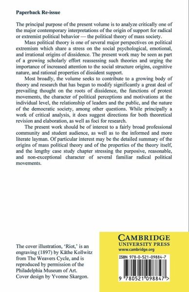 The principal purpose of the present volume is to analyse critically one of the major contemporary interpretations of the origin of support for radical or extremist political behaviour - the political theory of mass society. Mass political theory is one of several major perspectives on political extremism which share a stress on the social psychological, emotional and irrational origins of dissidence. The present work may be seen as part of a growing scholarly effort reassessing such theories and urging the importance of increased attention to the social structure origins, cognitive nature and rational properties of dissident support. The present work should be of interest to a fairly broad professional community and student audience, as well as to the informed and more literate layman. Of particular interest may be the detailed summary of the origins of mass political theory and of the properties of the theory itself and the lengthy case study chapter stressing the purposive, reasonable and non-exceptional character of several familiar radical political movements.