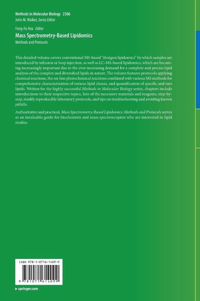 Mass Spectrometry-Based Lipidomics: An Overview.- High Confidence Shotgun Lipidomics Using Structurally Selective Ion Mobility-Mass Spectrometry.- Global Lipidomics Profiling by a High Resolution LC-MS Platform.- Comprehensive Structural Characterization of Lipids by Coupling Paternò-Büchi Reaction and Tandem Mass Spectrometry.- Chemical Derivatization-Aided High Resolution Mass Spectrometry for Shotgun Lipidome Analysis.- Quantitative Analysis of Polyphosphoinositide, Bis(monoacylglycero)phosphate, and Phosphatidylglycerol Species by Shotgun Lipidomics after Methylation.- A Mass Spectrometry-Based Shotgun Lipidomics Using Charge-Switch Derivatization for Analysis of the Complex Long-Chain Fatty Acids.- One-Pot Extractive Transesterification of Fatty Acids Followed by DMOX Derivatization for Location of Double Bonds Using GC-EI-MS.- Ceramide Analysis by Multiple Linked-Scan Mass Spectrometry Using a Tandem Quadrupole Instrument.- Comprehensive Mouse Skin Ceramide Analysis on a Solid-Phase and TLC Separation with High Resolution Mass Spectrometry Platform.- Mass Spectrometric Analysis of Meibomian Gland Lipids.- Quantification of Plasma Oxylipins Using Solid Phase Extraction and Reversed-Phase Liquid Chromatography-Triple Quadrupole Mass Spectrometry.- Targeted Lipidomics of Drosophila melanogaster During Development.- Shotgun Lipidomic Analysis of Leishmania Cells.- Characterization of the Uncommon Lipid Families in Corynebacterium glutamicumby Mass Spectrometry.- Mass Spectrometric Analysis of Bioactive Sphingolipids in Fungi.- Analytical Methodologies for Lipidomics in Hemp Plant.- Shotgun Bacterial Lipid A Analysis Using Routine MALDI-TOF Mass Spectrometry.- Imaging of Polar and Nonpolar Lipids Using Desorption Electrospray Ionization/Post-Photoionization Mass Spectrometry.- Matrix-Assisted Laser Desorption/Ionization-Mass Spectrometry Imaging of Lipids in the Ischemic Rat Brain Section: A Practical Approach.
