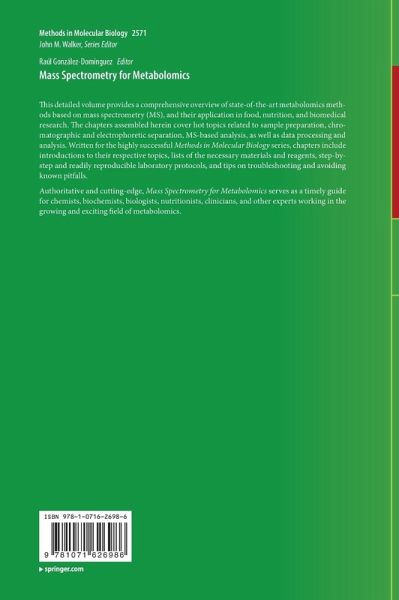 Comprehensive and High-Throughput Method for Quantitative Fingerprinting of Phenolic Compounds.- Determination of Volatile Metabolites in Vinegars by Solid Phase Microextraction-Gas Chromatography-Mass Spectrometry (SPME-GC-MS).- Determination of Volatile Metabolites in Vinegars by Stir Bar Sorptive Extraction-Gas Chromatography-Mass Spectrometry (SBSE-GC-MS).- Discovery of Food Intake Biomarkers Using Metabolomics.- Metabolomic Characterization of the Antiproliferative Activity of Bioactive Compounds from Fruit By-Products Against Colon Cancer Cells.- Untargeted Metabolomics by Liquid Chromatography-Mass Spectrometry in Biomedical Research.- Untargeted Metabolomics for Disease-Specific Signatures.- Metabolomics Analysis of Blood, Urine, and Saliva Samples Based on Capillary Electrophoresis-Mass Spectrometry.- Capillary Electrophoresis-Mass Spectrometry for the Direct Analysis of Metabolites in Highly Saline Samples Using In-Capillary Preconcentration.- Chemical Derivatization to Enhance Capillary Electrophoresis Mass Spectrometric Analysis of Acidic Metabolites in Mammalian Cells.- Untargeted Metabolomics Based on Liquid Chromatography-Mass Spectrometry for the Analysis of Plasma and Erythrocyte Samples in Childhood Obesity.- Characterization of the Plasmatic and Erythroid Multi-Elemental Biodistribution in Childhood Obesity Using a High-Throughput Method for Size-Fractionation of Metal Species.- Analysis of Brain Metabolites Using Two Complementary Ultra-High Performance Liquid Chromatography Mass Spectrometry Methods.- Analysis of Cholesterol from the Liver Using Gas Chromatography-Mass Spectrometry.- Metabolomics Analysis of Aqueous Humor Based on Liquid Chromatography-Mass Spectrometry.- Analyses and Localization of Serotonin and L-DOPA in Ocular Tissues by Imaging Mass Spectrometry.- Isobaric Incorporation of C13-Histidine for the Assessment of Remyelination.- Isolation and Lipidomic Screening of Human Milk Extracellular Vesicles.- Mass Spectrometry-Based Untargeted Metabolomics and Lipidomics Platforms to Analyze Cell Culture Extracts.- Data Processing and Analysis in Mass Spectrometry-Based Metabolomics.- Data Processing and Analysis in Liquid Chromatography-Mass Spectrometry-Based Targeted Metabolomics.- Instrument-Agnostizing Methodology for Liquid Chromatography-Mass Spectrometry Systems.