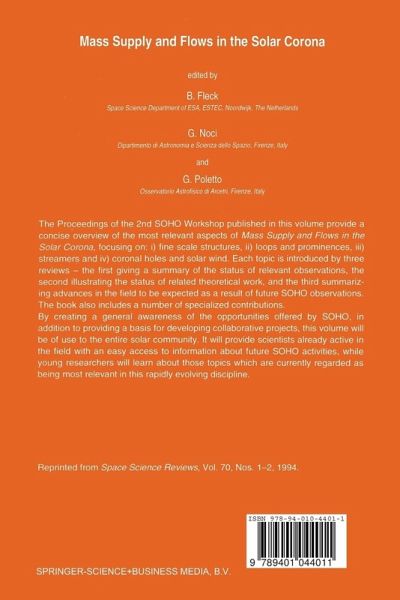 nd The 2 SORO Workshop on "Mass Supply and Flows in the Solar Corona" was held in Marciana Mariana on the island of Elba, Italy, in the week September 27 to October 1, 1993, as part of a series of workshops planned by the Solar Corona and Particles Working Group of the SOHO Science Working Team (SWT). The purpose of this workshop series is to acquaint the solar community with the capabilities of SORO, and prepare scientific projects and observing plans for the mission. This Workshop, which was at tended by more than one hundred scientists from different countries, focused on the following topics: 1) Fine Scale Structures 2) Loops and Prominences 3) Coronal Streamers 4) Coronal Roles and Solar Wind Each of these four topics was introduced by an observational and a theo retical overview highlighting the most recent advances in their area. A third review illustrated how SORO might help in solving open problems. Oral pa pers and poster presentations were followed by Working Group sessions. On the last day of the Workshop the Group Leaders reported on the activities of their Working Group. These proceedings include most of the papers presented at the Work shop, including the poster papers and Working Group reports by the Group Leaders as well as two overview papers of the SORO mission. All papers have been refereed.