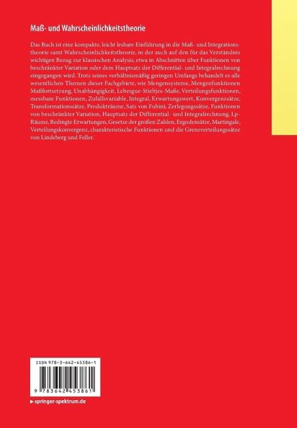 Das Buch ist eine kompakte, leicht lesbare Einführung in die Maß- und Integrationstheorie samt Wahrscheinlichkeitstheorie, in der auch auf den für das Verständnis wichtigen Bezug zur klassischen Analysis, etwa in Abschnitten über Funktionen von beschränkter Variation oder dem Hauptsatz der Differential- und Integralrechnung eingegangen wird. Trotz seines verhältnismäßig geringen Umfangs behandelt es alle wesentlichen Themen dieser Fachgebiete, wie Mengensysteme, Mengenfunktionen Maßfortsetzung, Unabhängigkeit, Lebesgue-Stieltjes-Maße, Verteilungsfunktionen, messbare Funktionen, Zufallsvariable, Integral, Erwartungswert, Konvergenzsätze, Transformationssätze, Produkträume, Satz von Fubini, Zerlegungssätze, Funktionen von beschränkter Variation, Hauptsatz der Differential- und Integralrechnung, Lp-Räume, Bedingte Erwartungen, Gesetze der großen Zahlen, Ergodensätze, Martingale, Verteilungskonvergenz, charakteristische Funktionen und die Grenzverteilungssätze von Lindeberg und Feller