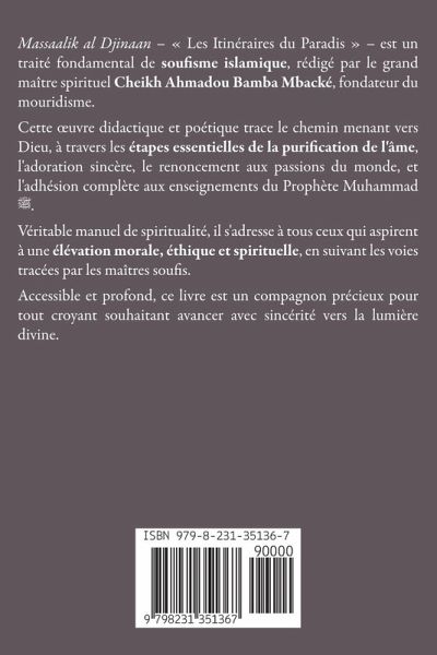 Massaalik al Djinaan - Les Itinéraires du Paradis - est un traité fondamental de soufisme islamique, rédigé par le grand maître spirituel Cheikh Ahmadou Bamba Mbacké, fondateur du mouridisme. Cette uvre didactique et poétique trace le chemin menant vers Dieu, à travers les étapes essentielles de la purification de l'âme, l'adoration sincère, le renoncement aux passions du monde, et l'adhésion complète aux enseignements du Prophète Muhammad ¿. Véritable manuel de spiritualité, il s'adresse à tous ceux qui aspirent à une élévation morale, éthique et spirituelle, en suivant les voies tracées par les maîtres soufis. Accessible et profond, ce livre est un compagnon précieux pour tout croyant souhaitant avancer avec sincérité vers la lumière divine.