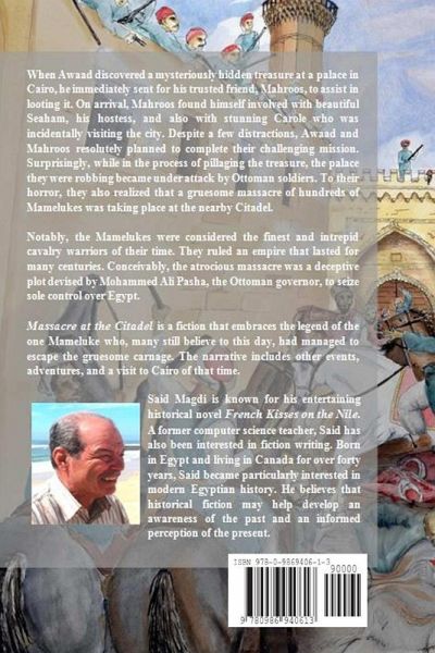 When Awaad discovered a mysteriously hidden treasure at a palace in Cairo, he immediately sent for his trusted friend, Mahroos, to assist in looting it. On arrival, Mahroos found himself involved with beautiful Seaham, his hostess, and also with stunning Carole who was incidentally visiting the city. Despite a few distractions, Awaad and Mahroos resolutely planned to complete their challenging mission. Surprisingly, while in the process of pillaging the treasure, the palace they were robbing became under attack by Ottoman soldiers. To their horror, they also realized that a gruesome massacre of hundreds of Mamelukes was taking place at the nearby Citadel. Massacre at the Citadel is a fiction that embraces the legend of the one Mameluke who, many still believe to this day, had managed to escape the gruesome carnage. The narrative includes other events, adventures and a visit to Cairo of that time.
