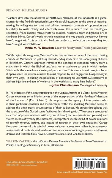 This book examines fifty instances from the afterlife of Matthew's "Massacre of the Innocents." Warren Carter argues that interpreters "think with" the scene's triad of power relations (tyrant, victims, means of tyranny) in various socio-political circumstances and media to make sense of these experiences and address their audiences.