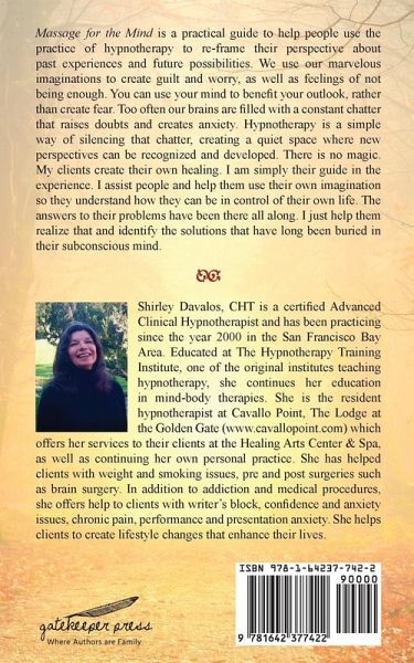 Massage for the Mind is a practical guide to help people use the practice of hypnotherapy to re-frame their perspective about past experiences and future possibilities. We use our marvelous imaginations to create guilt and worry, as well as feelings of not being enough. You can use your mind to benefit your outlook, rather than create fear. Too often our brains are filled with a constant chatter that raises doubts and creates anxiety. Hypnotherapy is a simple way of silencing that chatter, creating a quiet space where new perspectives can be recognized and developed. There is no magic. My…mehr