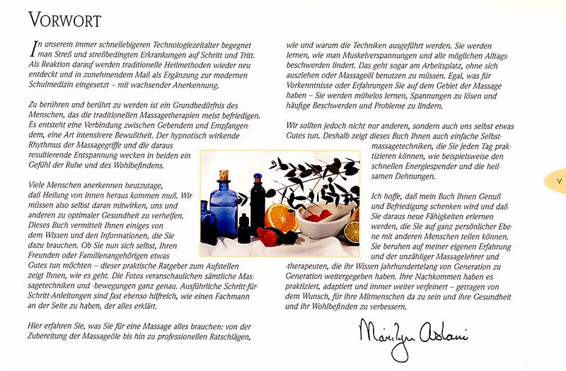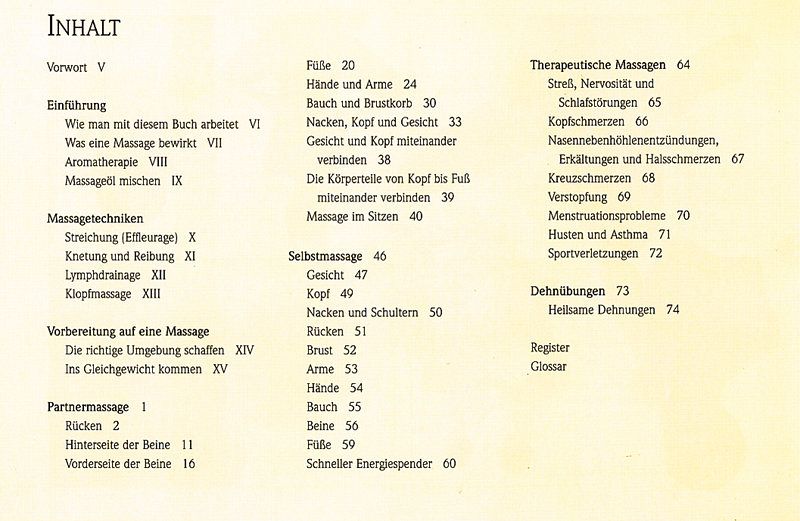Ein wunderschönes Buch in praktischer, verdeckter Ringheftung, das sich hervorragend zur laufenden Konsultation während der Massage eignet, da es nicht zuklappen und jeder Griff in jeder Phase kontrolliert werden kann. In Wort und rund 430 schönen und gestochenen Farbbildern lernen wir alle gängigen entspannenden und heilenden Massagetechniken kennen, die sich zum Teil allein durchführen lassen (Selbstmassage), zum grösseren Teil jedoch für die Partnermassage gedacht sind.