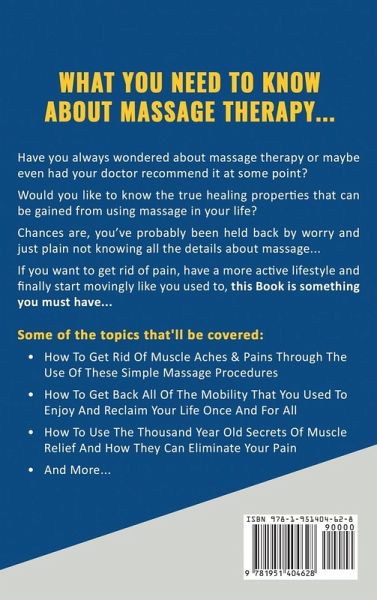 What You Need To Know About Massage Therapy... Have you always wondered about massage therapy or maybe even had your doctor recommend it at some point? Would you like to know the true healing properties that can be gained from using massage in your life? Chances are, you’ve probably been held back by worry and just plain not knowing all the details about massage... If you want to get rid of pain, have a more active lifestyle and finally start movingly like you used to, this Book is something you must have... Some of the topics that'll be covered: * How To Get Rid Of Muscle Aches & Pains Through The Use Of These Simple Massage Procedures * How To Get Back All Of The Mobility That You Used To Enjoy And Reclaim Your Life Once And For All * How To Use The Thousand Year Old Secrets Of Muscle Relief And How They Can Eliminate Your Pain * And More... Don’t wait another moment to enjoy from this information – Get your copy of Massage Therapy right away!