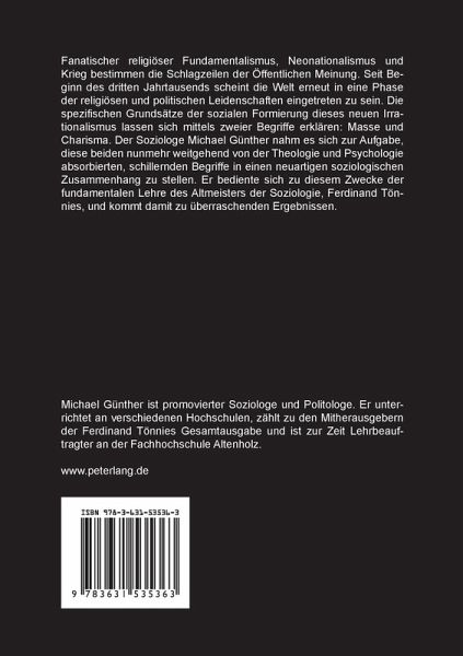Fanatischer religiöser Fundamentalismus, Neonationalismus und Krieg bestimmen die Schlagzeilen der Öffentlichen Meinung. Seit Beginn des dritten Jahrtausends scheint die Welt erneut in eine Phase der religiösen und politischen Leidenschaften eingetreten zu sein. Die spezifischen Grundsätze der sozialen Formierung dieses neuen Irrationalismus lassen sich mittels zweier Begriffe erklären: Masse und Charisma. Der Soziologe Michael Günther nahm es sich zur Aufgabe, diese beiden nunmehr weitgehend von der Theologie und Psychologie absorbierten, schillernden Begriffe in einen neuartigen soziologischen Zusammenhang zu stellen. Er bediente sich zu diesem Zwecke der fundamentalen Lehre des Altmeisters der Soziologie, Ferdinand Tönnies, und kommt damit zu überraschenden Ergebnissen.